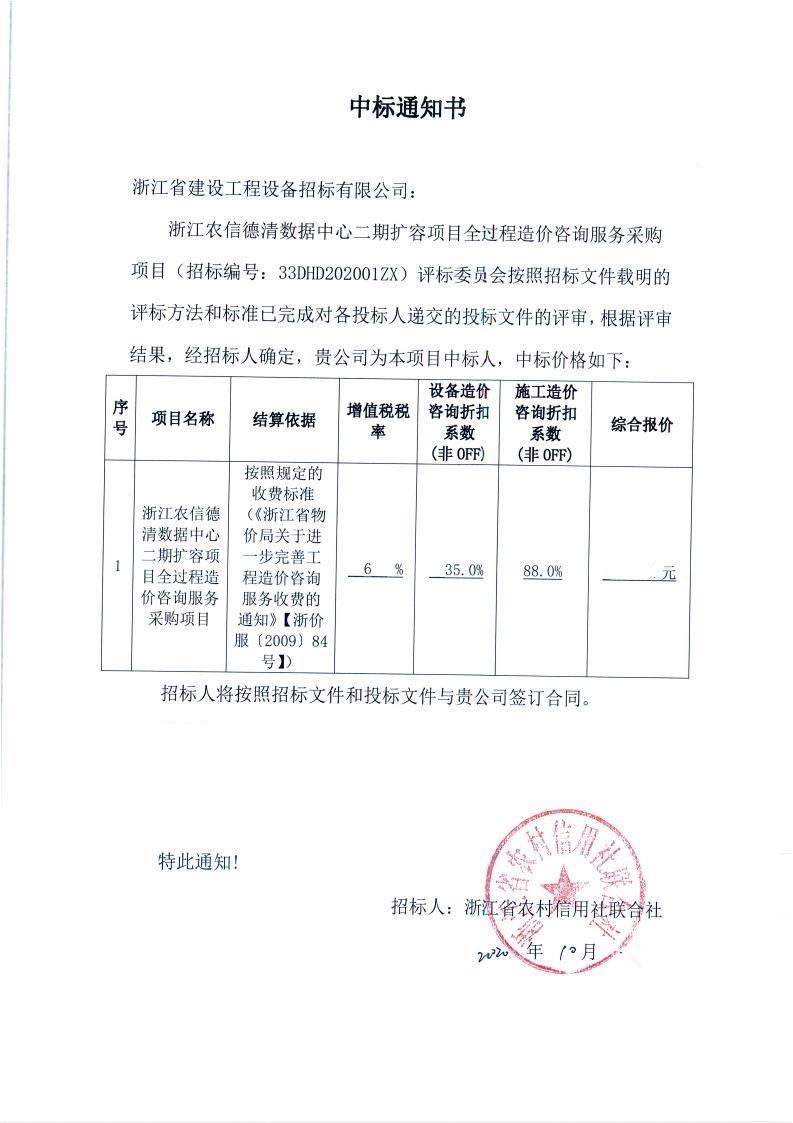 簡報(浙江農信德清數據中心二期擴容項目全過程造價咨詢采購項目中標)